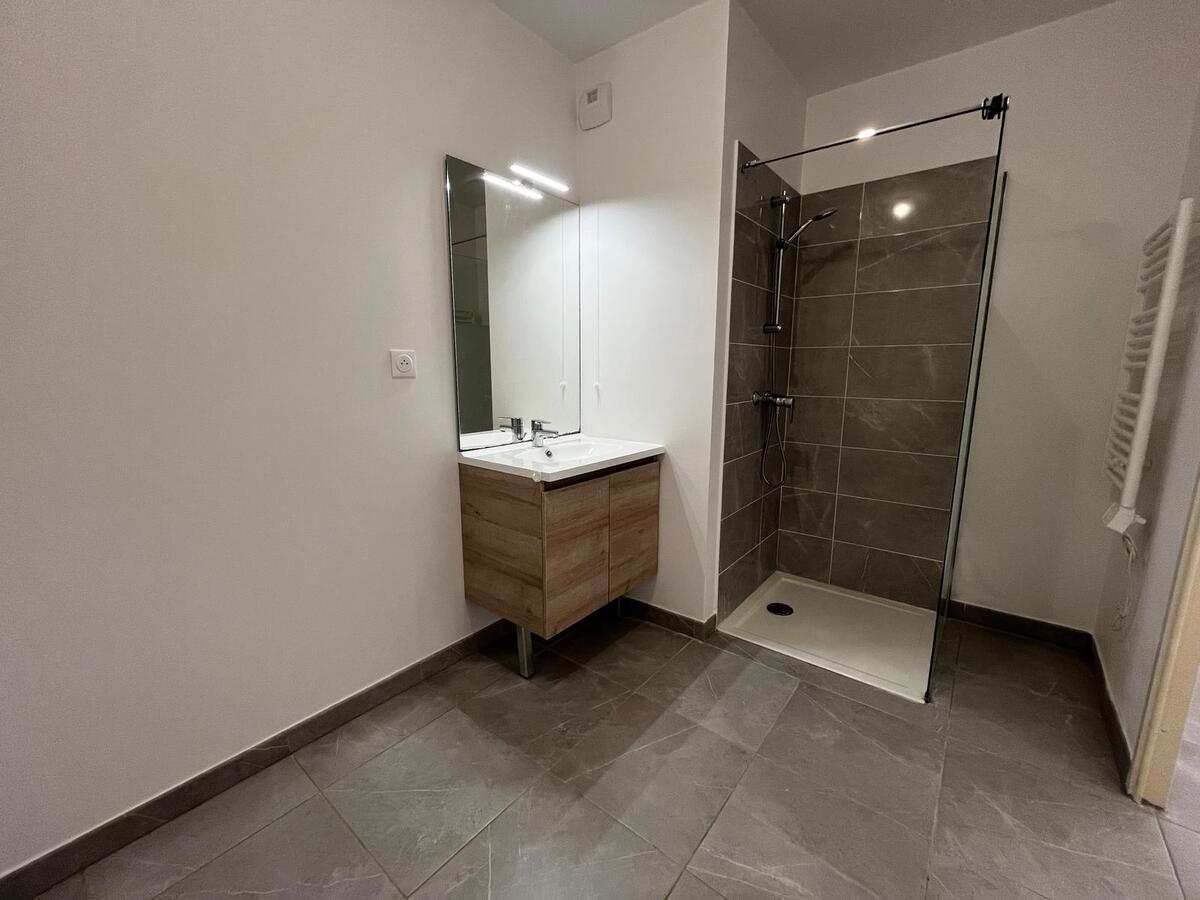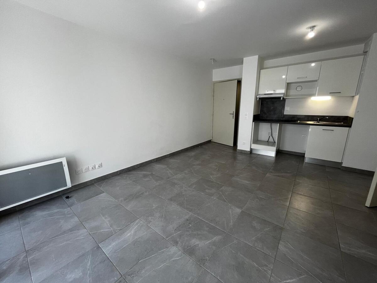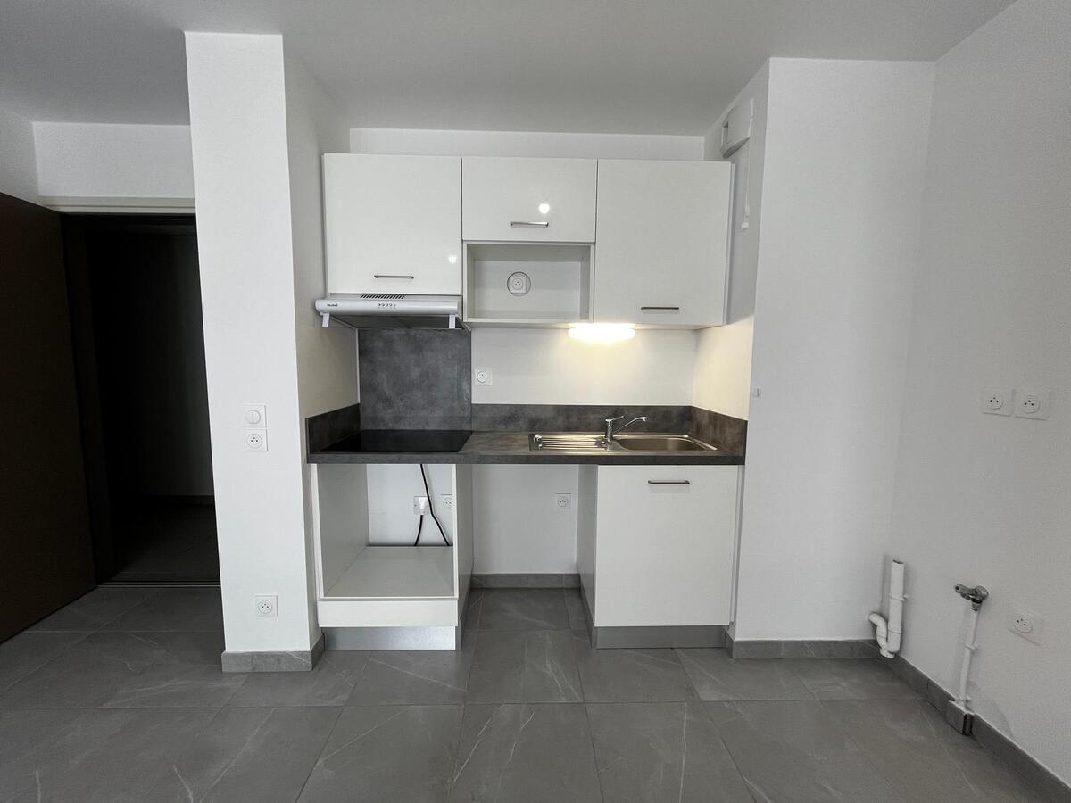 L'appartement fait 38,50 m² avec un séjour/cuisine équipé plaque et hotte et faisant 16,94m² le tout donnant sur une terrasse de 7,39 m².