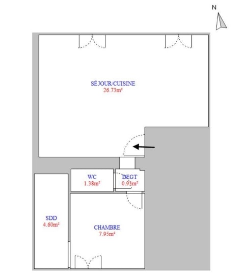 Le bien est doté d'un séjour/cuisine équipée plaques et hotte de 26,73m², d'une chambre suite parentale de 7,95m² et d'une salle d'eau avec espace dressing de 4,60m² ainsi que d'un WC séparé.