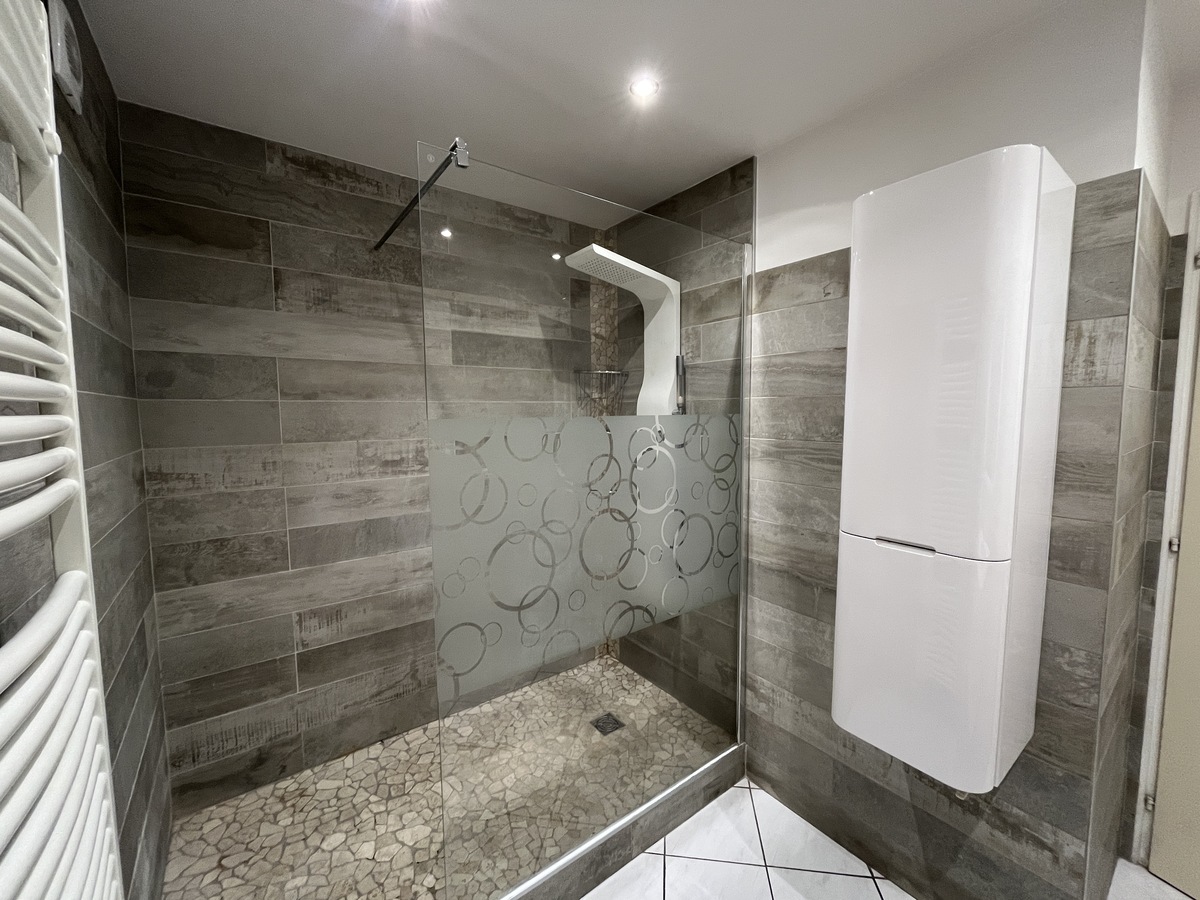 Cet appartement rénové est composé d'un séjour cuisine aménagée et équipée (four, plaque, hotte, lave vaisselle, frigidaire ) d'environ 28 m2, de 3 chambres de 11 m2 environ chacune, un espace buanderie, une salle d'eau avec machine à laver et un WC séparé.