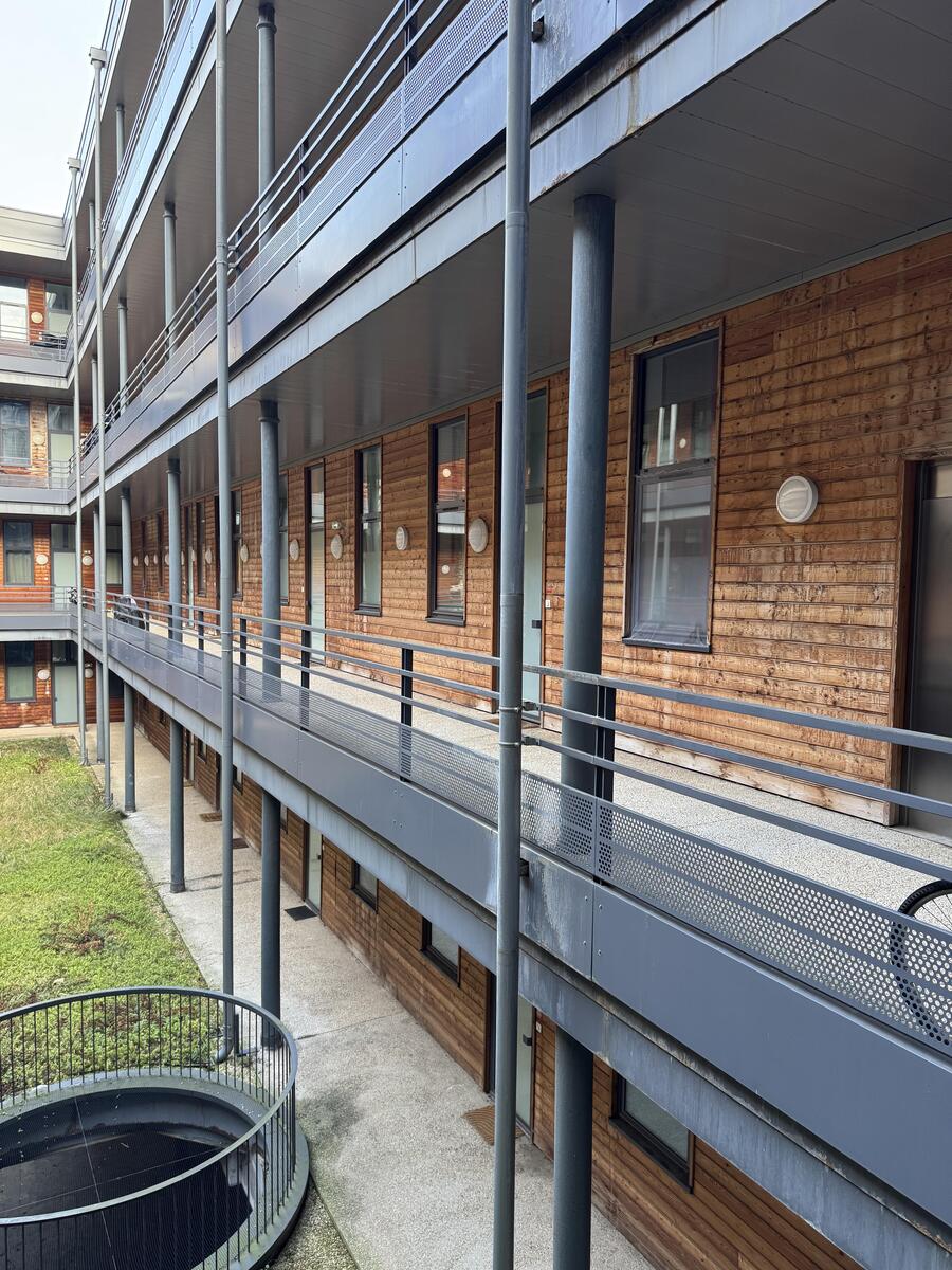 L’appartement se compose, au rez-de-chaussée, d’un séjour avec cuisine ouverte, créant un espace de vie convivial et fonctionnel, prolongé par un balcon. Ce niveau comprend également une chambre avec placard d’environ 9 m², un bureau de surface équivalente, une salle de bain équipée d’une douche et d’une baignoire, un WC séparé ainsi qu’un cellier offrant un espace de rangement supplémentaire.