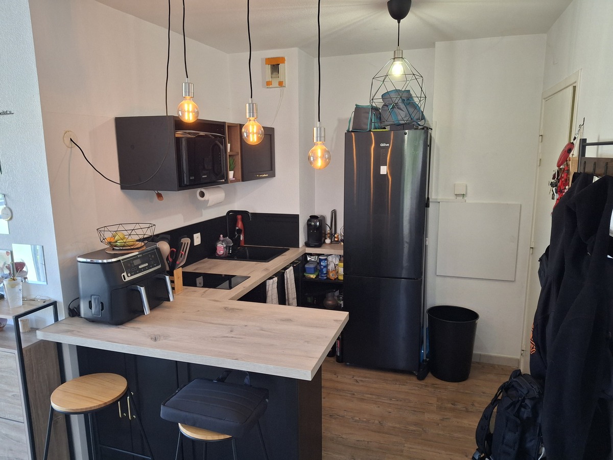 Ce bien se compose d’un bel espace séjour avec cuisine ouverte aménagée et équipée (plaques induction, rangements hauts et bas, évier), le tout, agrémenté de parquet,