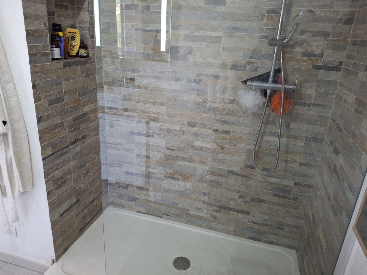 Une vaste salle d’eau fonctionnelle avec cabine de douche, meuble vasque, miroir, WC ainsi que d’un placard offrant un espace de rangement pratique.