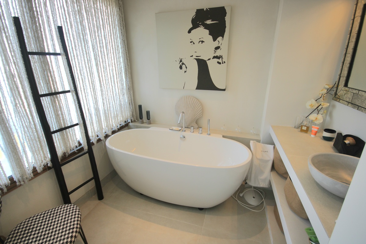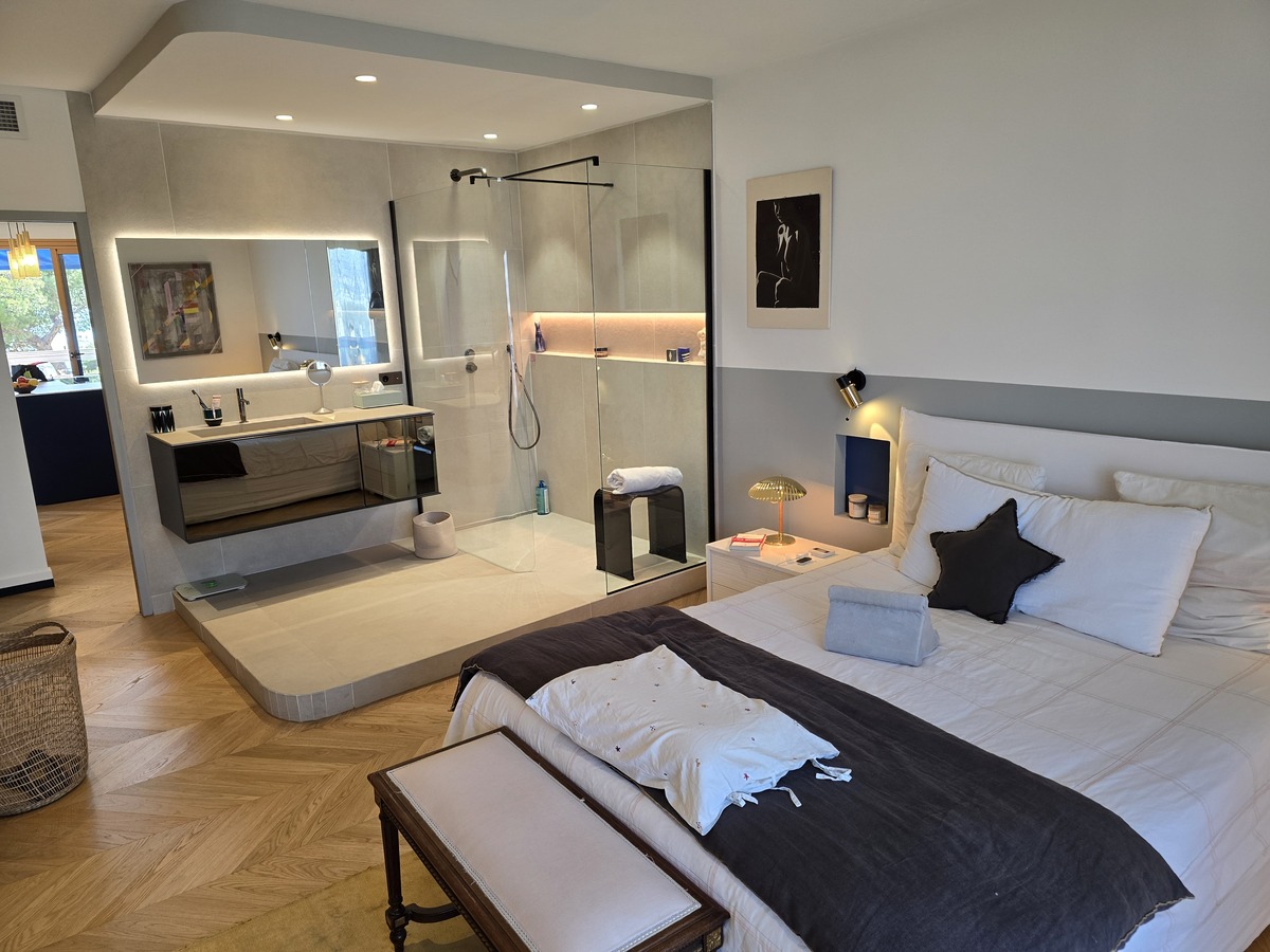 L’appartement comprend deux chambres, chacune dotée de sa salle d’eau ou salle de bains privative, ainsi qu’un WC indépendant, un cellier et une buanderie. L’ensemble a été entièrement rénové avec des matériaux de qualité et une décoration sobre, aux lignes intemporelles.